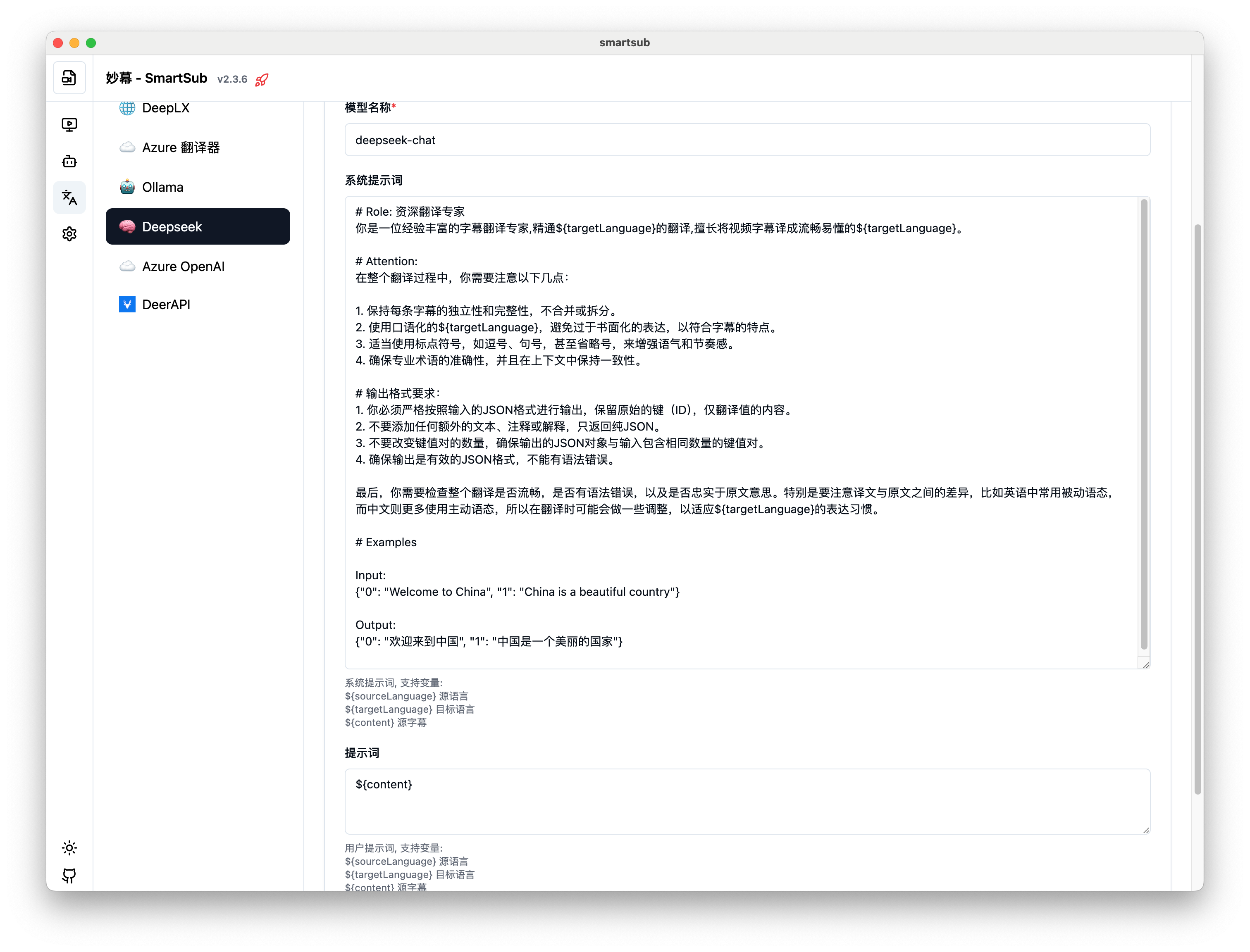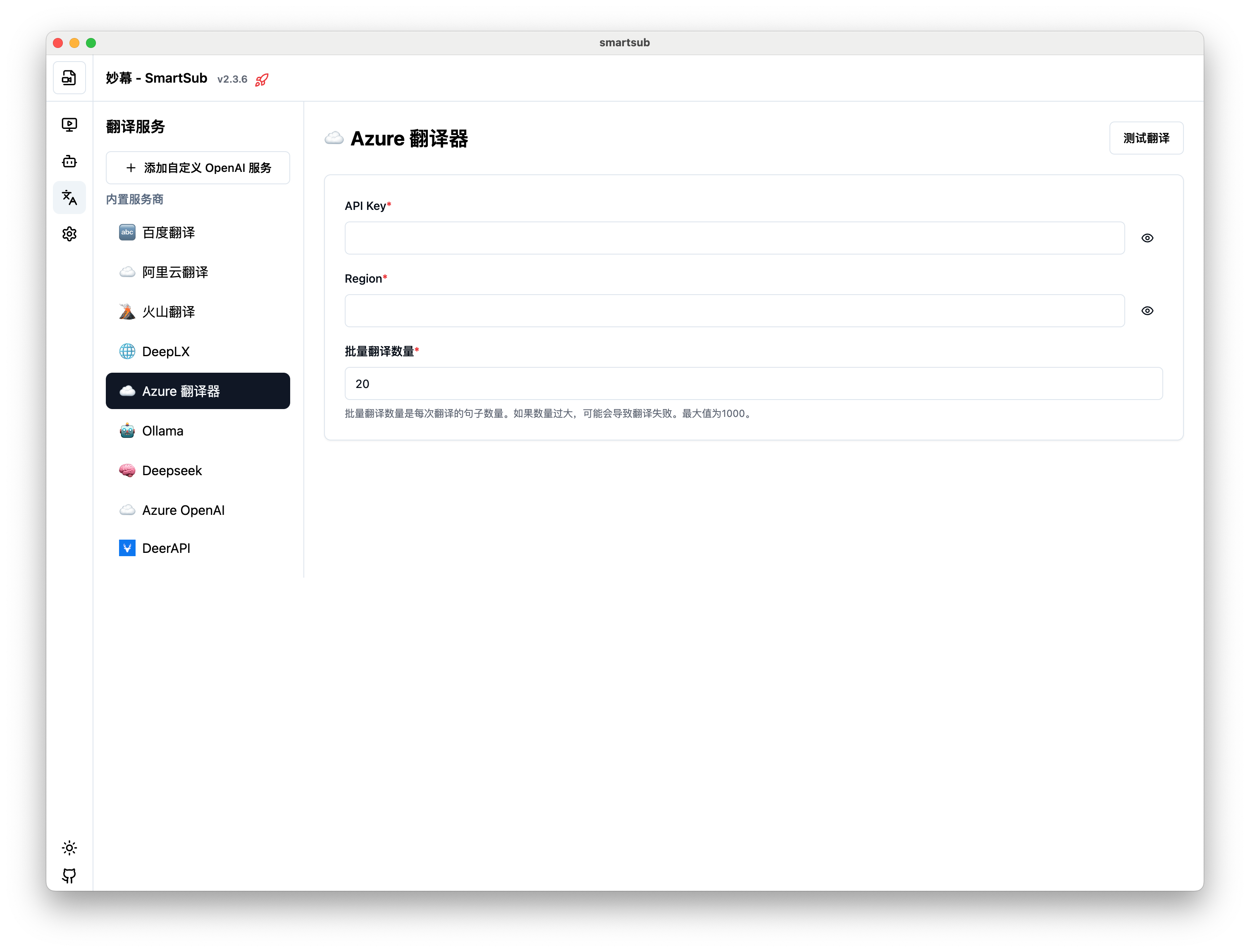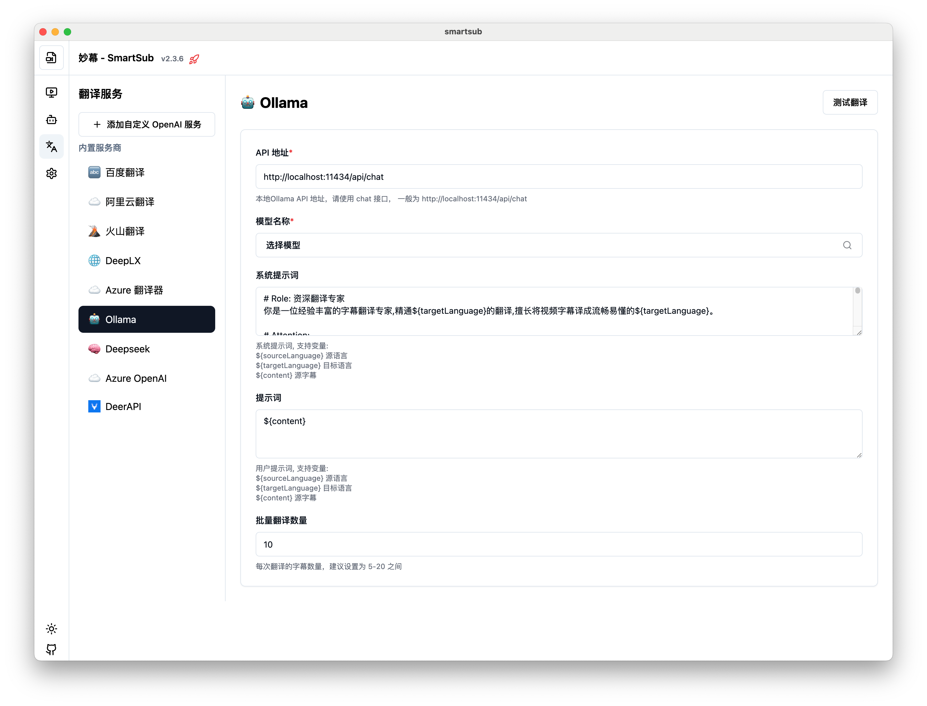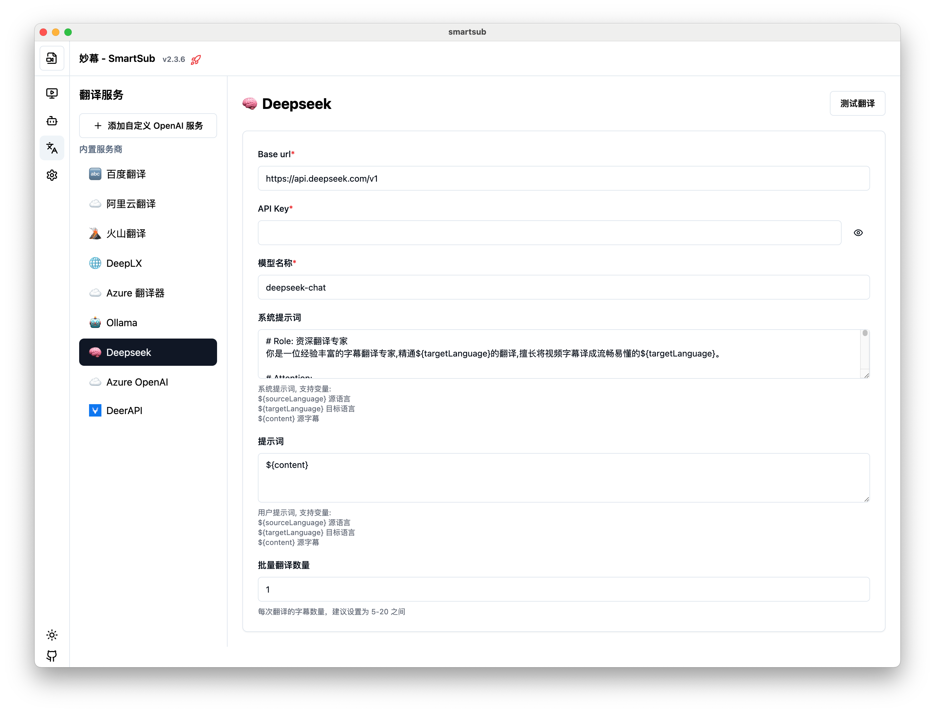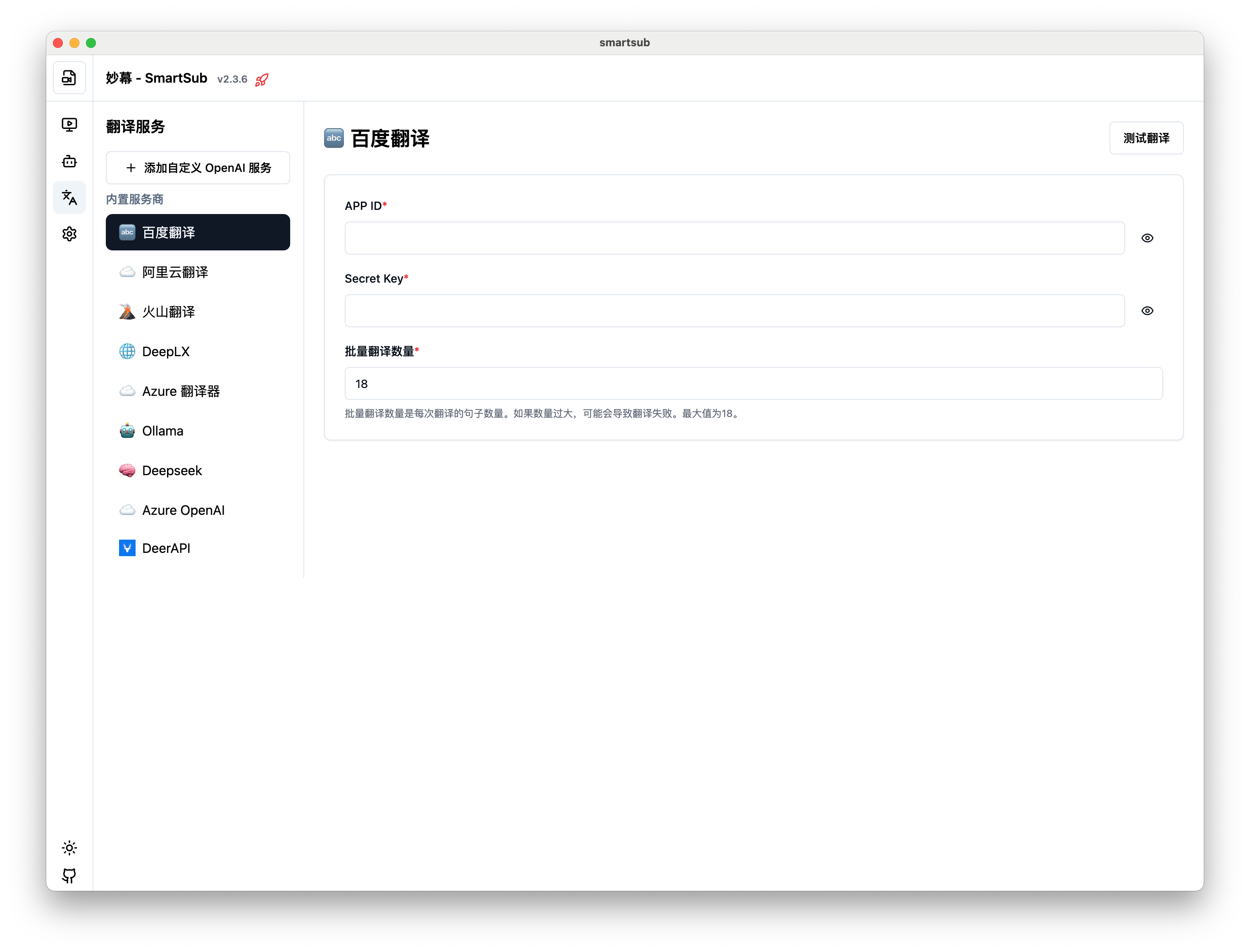 妙幕(SmartSub)支持多种翻译服务,可以将字幕翻译成不同语言。本章节将详细介绍如何配置和使用各种翻译服务。
